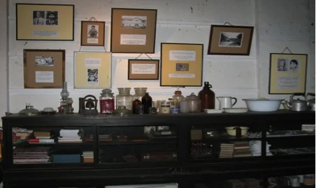 Law’s rationale for choosing 74 Main Street, Papan as a suitable site for reflecting upon Sybil’s story is multi-pronged. First, Law highlighted how the fact that ‘this place was where Sybil actually stayed and did all the very brave acts that she did [during the war] makes it perfect to also tell Sybil’s story… People can come here and they can see what living quarters were like for Sybil as well as many of the local population at that time, and the conditions that she had to work in’ (pers. comm. 2008). Second, the location of Papan itself was seen as a good way to show people what Perak was like before it became as it has become now. The geographical attributes of Papan, surrounded by mountains and beautiful lakes, would also interest those ‘nostalgic for the good old days’ (pers. comm. 2008). Its proximity to Ipoh, rich mining history, and availability of abandoned shophouses to be re-adapted into shops, were also seen as potentially allowing Papan to become, over time, a major tourist attraction. In the light of how, as Law puts it, ‘When I first came here, everything was all broken – broken roof, broken walls and there were things growing in the rooms’, [9] Law repaired parts of the shophouse that were damaged and replicated the clinic as it was. As there were not many records of what the place looked before, Law just recreated the general feel of the place as best he could, based on descriptions in Sybil’s memoirs and testimonies from living witnesses. He also collected many things from the era and put them in the museum to give an idea of what the clinic was like. This included furniture and other items from that time, such as an old bicycle, family photographs, farming and mining implements, all donated to the museum or simply picked up somewhere. [10] Law also left aspects of the shophouse untouched such as a hole under the stairs where Sybil might have hidden radio transmitters, as well as the back door where the jungle operatives gained access through a secret knock.